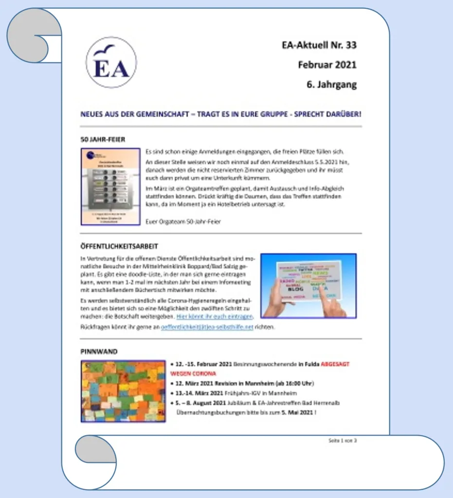 Bitte sprecht in Euren Gruppen über die Themen, insbesondere über die zukünftig vakanten Dienste. Es braucht Personen, die – entsprechend des 12. Schrittes – sich für EA einbringen wollen.
